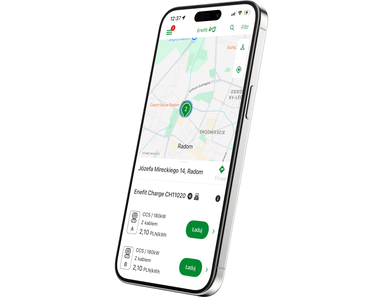 Korzystaj z wygodnej aplikacji Enefit Charge Polska, w której znajdziesz wszystkie informacje i sprawdzisz dostępność stacji ładowania.